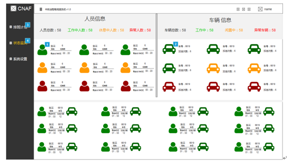 人員信息界面:分別顯示每個員工狀態與信息,信息包括本日完成任務次數,姓名,車輛編號。