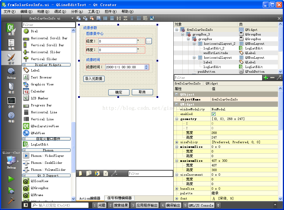控件編寫完畢以后,把生成的dll和lib文件一起拷貝到Qt安裝目錄下的插件目錄里,比如我安裝在D盤里的Qt 4.8.4,路徑為:D:Qt4.8.4pluginsdesigner,拷貝進去以后,這個插件就可以被Qt Designer加載了,此時這個自定義控件就可以像普通的控件一樣使用了。當然如有必要,還可以給這個控件添加一些信號和槽,另外按照經緯度的取值范圍不同,做一下區分經度和維度的處理,本例中不需要這么復雜,就不再深入探索了,下面是使用自定義的經緯度輸入控件的效果: