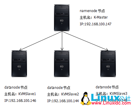 我們使用4臺機器來搭建Hadoop完全分布式環(huán)境,4臺機器的拓撲圖如下圖所示: