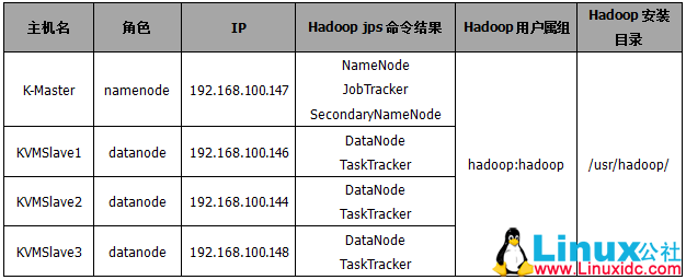 [hadoop@KVMSlave1 ~]$ cd /usr/ [hadoop@KVMSlave1 usr]$ sudo scp -r hadoop@K-Master:/usr/hadoop/ . [hadoop@KVMSlave1 usr]$ sudo chown -R hadoop:hadoop hadoop/ #slaves文件內(nèi)容刪除,或者直接刪除slaves [hadoop@KVMSlave1 usr]$ rm /usr/hadoop/conf/slaves