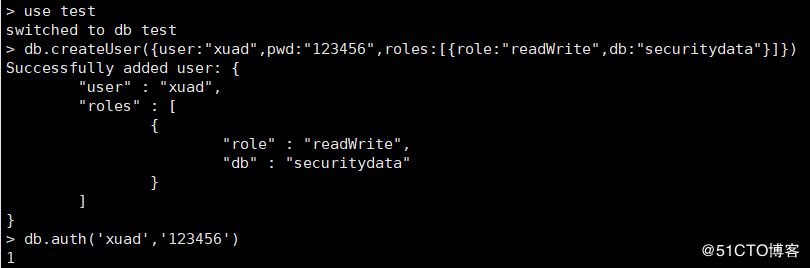 > db.createUser({user:"xuad",pwd:"123456",roles:[{role:"readWrite",db:"securitydata"}]})