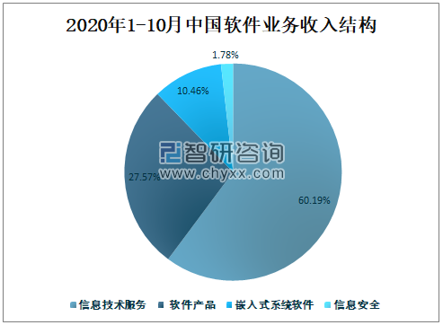 2020年1-10月中國信息技術服務收入占全國軟件業(yè)務總收入的60.19%,占比最大;軟件產(chǎn)品收入占全國軟件業(yè)務總收入的27.57%;嵌入式系統(tǒng)軟件收入占全國軟件業(yè)務總收入的10.46%;信息安全收入占全國軟件業(yè)務總收入的1.78%。