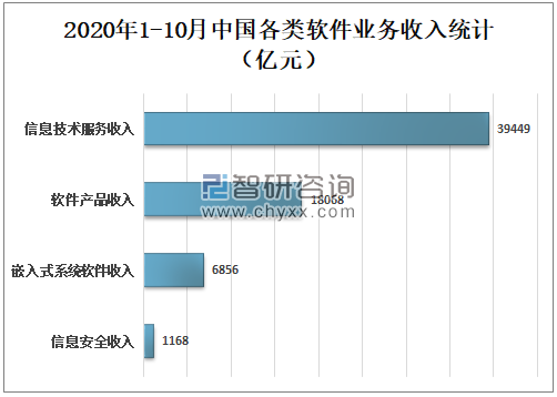 2020年1-10月中國信息安全收入為1168億元;嵌入式系統(tǒng)軟件收入為6856億元;軟件產(chǎn)品收入為18068億元;信息技術服務收入為39449億元。