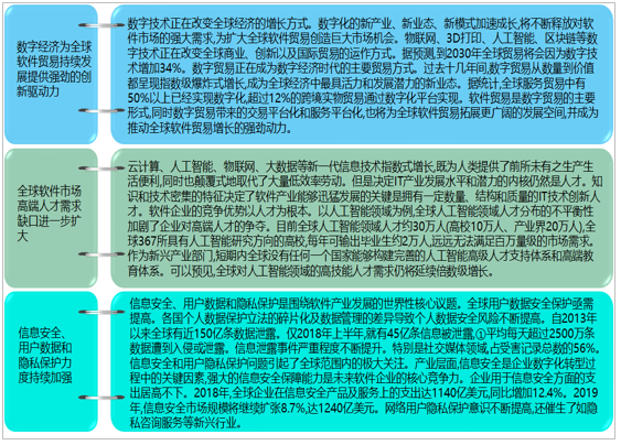隨著數(shù)字經(jīng)濟的發(fā)展為全球軟件貿(mào)易持續(xù)發(fā)展提供強勁的創(chuàng)新驅動力。未來全球軟件市場高端人才需求缺口進一步擴大。信息安全、用戶數(shù)據(jù)和隱私保護力度持續(xù)加強。