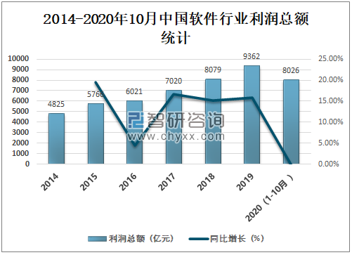 隨著中國軟件業(yè)務收入的增加,利潤總額也在持續(xù)增長,2019年中國軟件行業(yè)利潤總額達9362億元,較2018年增加了1283億元,同比增長達15.88%,2020年1-10月中國軟件行業(yè)利潤總額為8026億元,已超2017年中國軟件行業(yè)利潤總額。