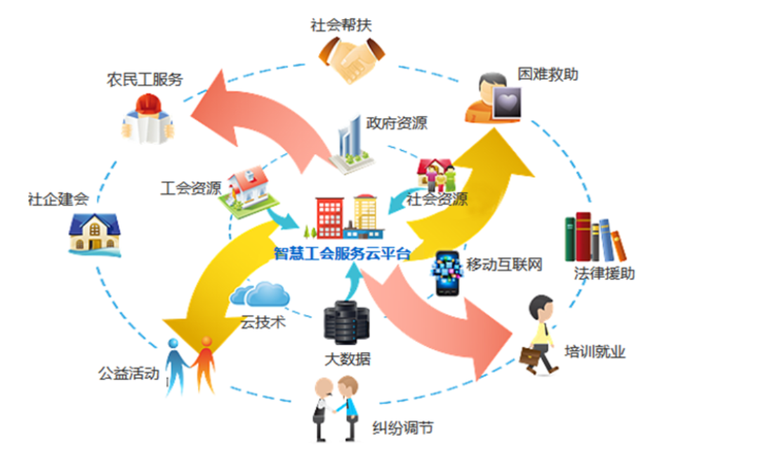 智慧工會(Smart Union)是指利用信息技術和互聯網技術,將現代化科技手段應用于工會組織管理和服務的一種發展模式。通過數字化、智能化和數據化的手段,智慧工會旨在提升工會組織的效能和服務水平,滿足會員的需求,并推動工會工作的創新和發展。智慧工會可以包括以下方面的應用: