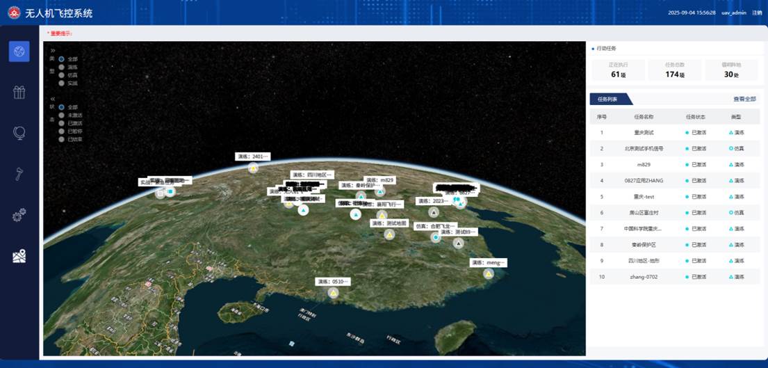 首頁概覽一屏盡覽蒼穹態勢:任務總數、執行中任務、無人機實時狀態清晰呈現,手機數據與雷達信號無縫匯入,任務列表同步刷新,決策絕不滯后。